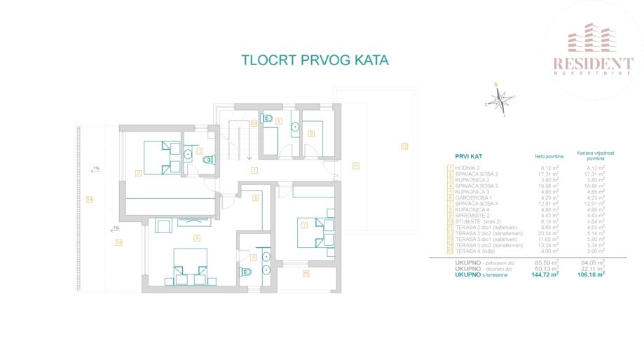 - 1. kata na kojem se nalaze tri spavaće sobe od kojih svaka ima vlastitu modernu kupaonicu, hodnik, spremište, dvije prostrane terasa i loggie. Ukupna površina prvog kata zajedno s terasama je 144,72m2.