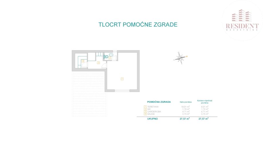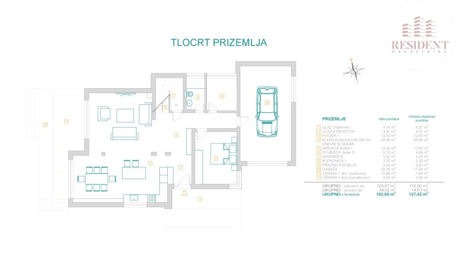 - prizemlja u kojem se nalazi prostrani dnevni boravak s blagovaonicom i modernom kuhinjom, spremište, hodnik, praonica rublja, spavaća soba i kupaonica. Vanjski dio prizemlja uključuje terasu koja je dijelom natkrivena te sadrži dio za sunčalište i preljevni bazen veličine 42m2. Ukupna površina prizemlja zajedno s terasama je 162,69 m2.