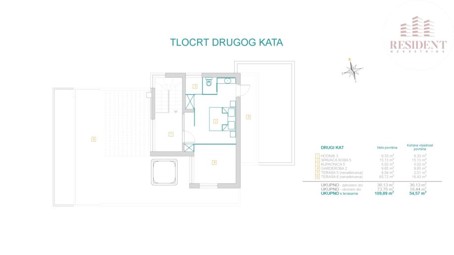 - 2. kata na kojem se nalazi glavna spavaća soba s kupaonicom koja uključuje hidromasažnu kadu, projekcijska soba s najmodernijom video i zvučnom tehnologijom. Vanjski dio uključuje dvije prostrane terase na kojima je prostor za druženje i sunčanje, jacuzzi i ljetni šank. Sa terasa se pruža predivan pogled na okolicu i predivan zalazak sunca, a sadržajno će krovna terasa sigurno biti mjesto čestog boravka i druženja. Cjelokupna površina drugog kata zajedno s terasama je 109,89 m2.
