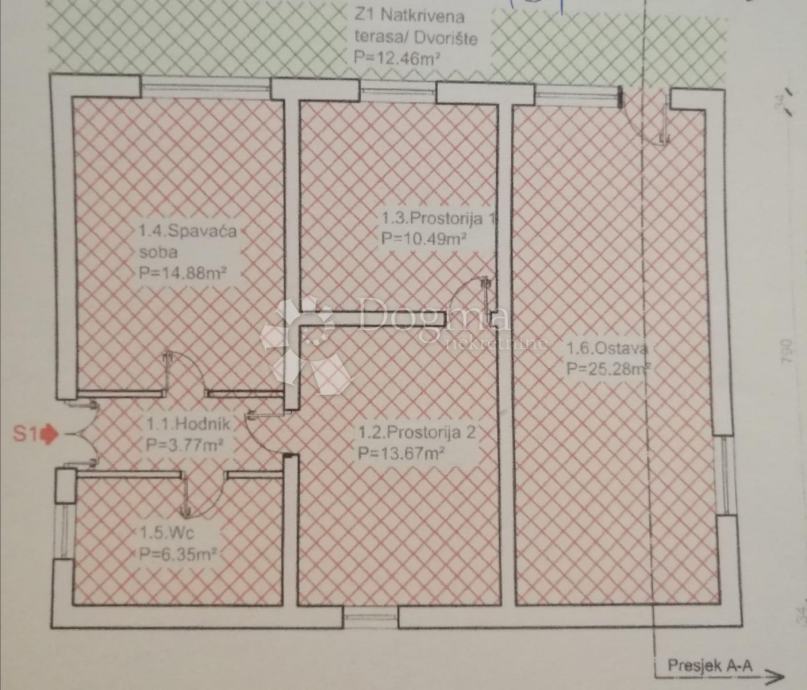 • Sastoji se od: hodnik (3,77 m2), kupaona (6,35 m2), soba 1 (14,88 m2), soba 2 (13,67 m2), soba 3 (10,49 m2), natkrivena terasa (12,46 m2) i dodatna prostorija