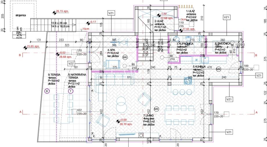 Na katu se smjestio središnji dio vile – prostrani dnevni boravak koji se skladno spaja s kuhinjom i blagovaonicom. Ovaj otvoreni prostor odiše luksuzom i toplinom, čineći ga idealnim mjestom za okupljanja i uživanje u pogledu na okolnu prirodu. Pored kuhinje se nalazi praktična smočnica, a dodatna kupaonica osigurava udobnost za goste. Posebnu draž ovom dijelu vile daje ekskluzivna SPA zona s teretanom, kreirana za potpuni odmor i relaksaciju. Velike staklene stijene vode na natkrivenu i nenatkrivenu terasu, s koje se pruža predivan pogled na mediteransko okruženje. Terase omogućuju boravak na otvorenom tijekom cijele godine, bilo za jutarnju kavu ili opuštanje uz zalazak sunca.