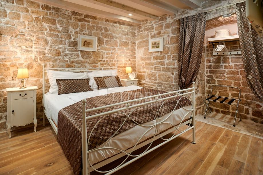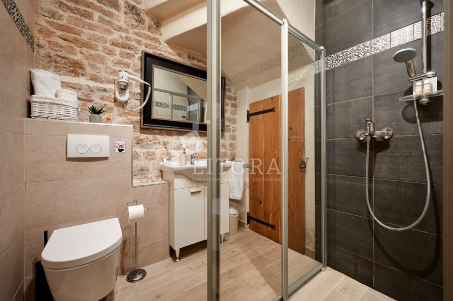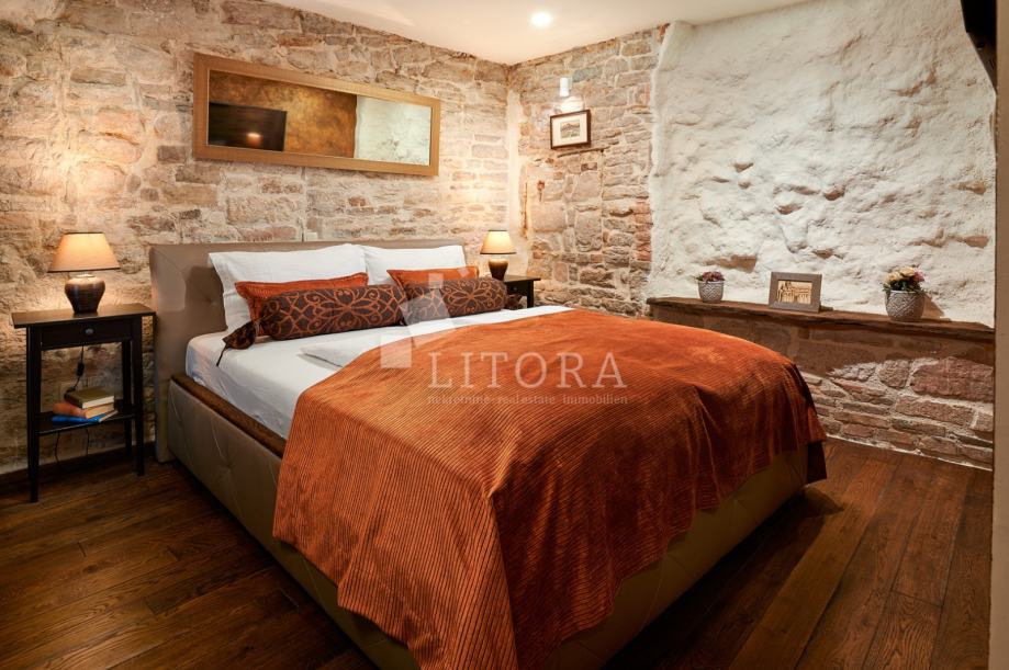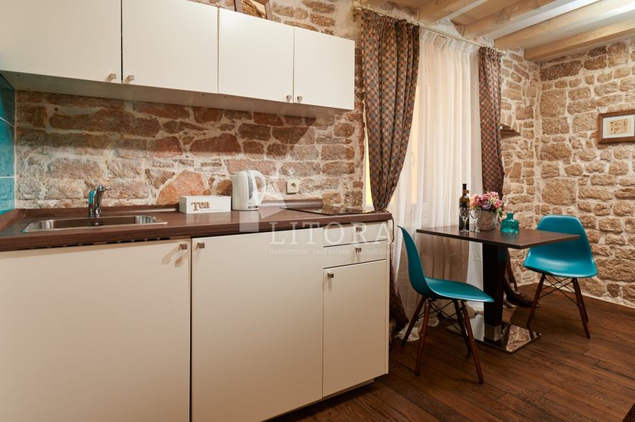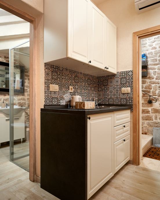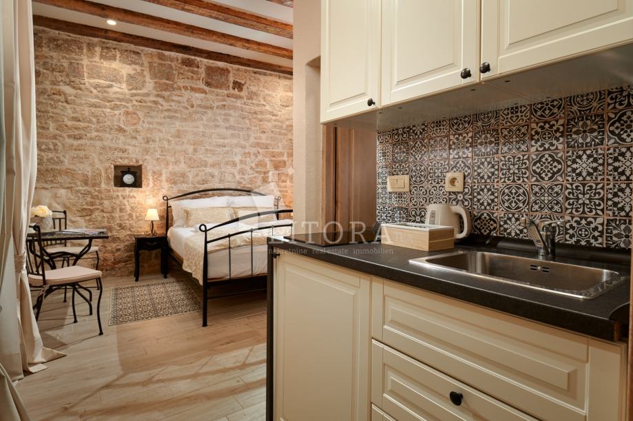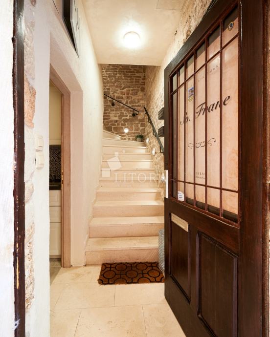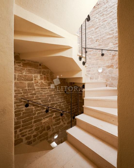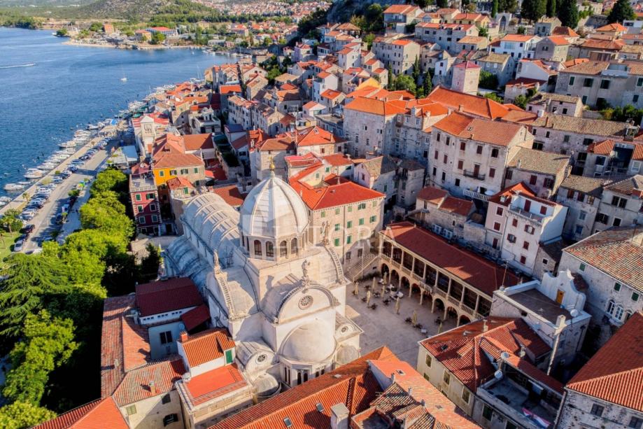 U srcu šibenske stare gradske jezgre, u mirnoj pješačkoj zoni, smještena je potpuno renovirana kamena kuća na četiri etaže, ukupne stambene površine 108 m². Nekretnina je preuređena 2018. godine i podijeljena u četiri moderno uređena studio apartmana, od kojih svaki zauzima po jednu etažu. Svaka jedinica sastoji se od dnevno-spavaće sobe s mini kuhinjom te prostrane i suvremeno opremljene kupaonice. Krov je dijelom krovna terasa s pogledom na grad. Pri renovaciji posebna pažnja posvećena je očuvanju autentičnosti i šarma dalmatinske kamene arhitekture. Vanjski zidovi od prirodnog kamena obnovljeni su pjeskarenjem i fugiranjem, dok su interijeri oplemenjeni kvalitetnom PVC stolarijom i drvenom međukatnom konstrukcijom. Kuća je u potpunosti namještena i opremljena, svaka stambena jedinica ima vlastiti klima uređaj, a prodaje se zajedno s kompletnim inventarom, što omogućuje trenutno bavljenje turističkim najmom. Ova nekretnina predstavlja izvanrednu investicijsku priliku u samom srcu Šibenika, na nekoliko koraka od kulturnih znamenitosti, restorana i mediteranskog ugođaja starog grada. Udaljenost od plaže je 1400m.