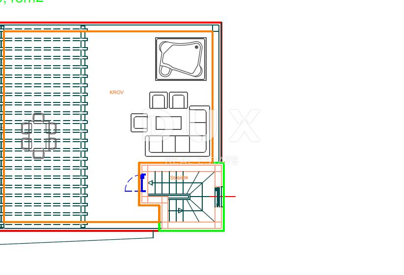 Stepenice vode na spektakularnu krovnu terasu od 55,99 m², koja predstavlja savršeno mjesto za opuštanje i uživanje u prekrasnom pogledu na okolni krajolik i nezaboravne zalaske sunca. Ovaj prostor pruža idealnu privatnost i može se koristiti kao vanjska blagovaonica ili lounge zona.