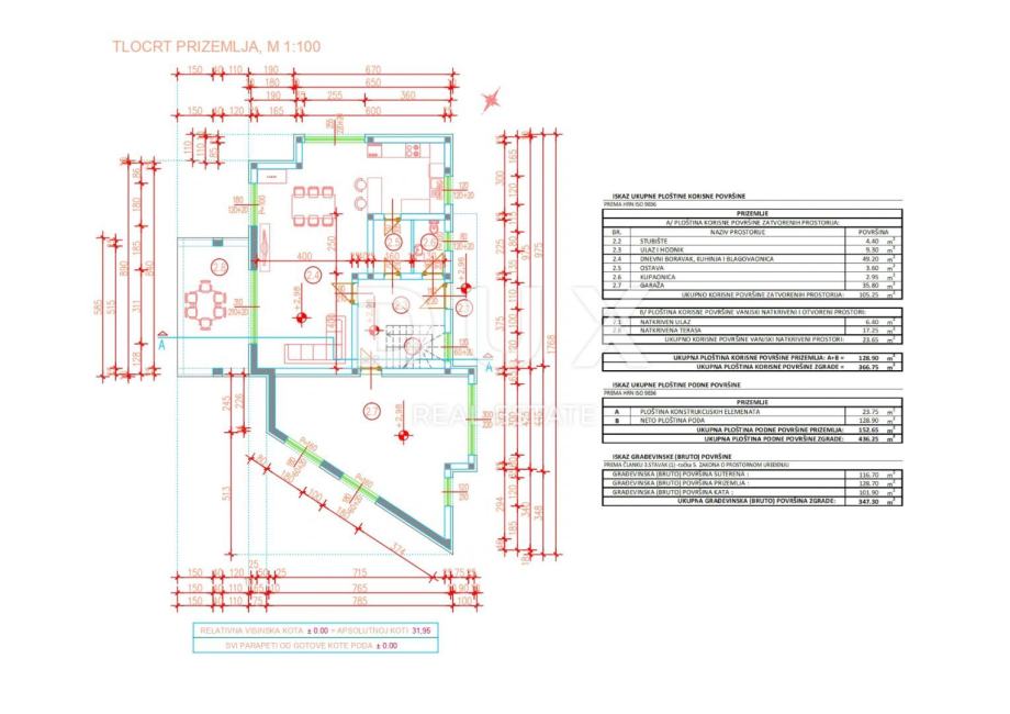 Prizemlje ove nekretnine osmišljeno je kao prostrani, otvoreni koncept. Središnji dio čini svijetli i prostrani dnevni boravak, savršeno povezan s blagovaonicom i kuhinjom koja ima i vlastito spremište. Iz dnevnog boravka izlazi se na terasu, idealnu za uživanje na svježem zraku i druženje s obitelji i prijateljima. Prizemlje također uključuje gostinjski toalet te prostranu garažu od 36 m², što osigurava dovoljno prostora za parkiranje i dodatnu pohranu.