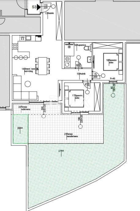 Sastoji se od hodnika, kupaonice, WC-a, dvije spavaće sobe, prostranog dnevnog boravka, blagovaonice i kuhinje.
