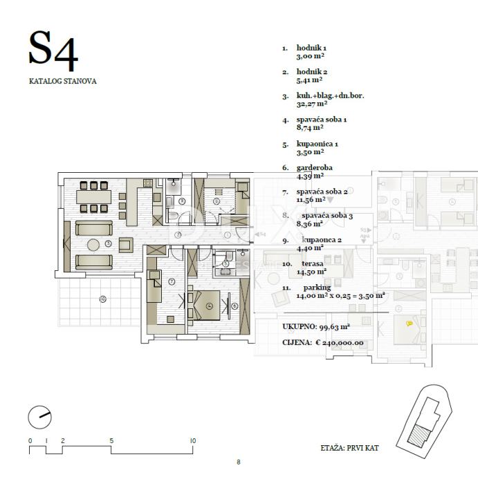 Stan površine 99,63 m2 nalazi se na prvom katu moderne zgrade s ukupno dva kata, koja se ističe svojim suvremenim dizajnom i visokokvalitetnom gradnjom. Ovaj prostrani stan nudi udoban i funkcionalan prostor, savršen za život.