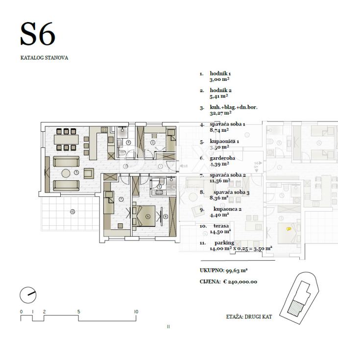 Stan površine 99,63 m2 nalazi se na drugom katu moderne zgrade s ukupno dva kata, koja se ističe svojim suvremenim dizajnom i visokokvalitetnom gradnjom. Ovaj prostrani stan nudi udoban i funkcionalan prostor, savršen za život.