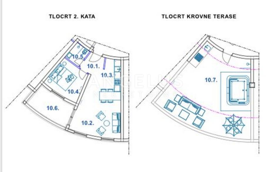 Prodaje se jednosoban apartman ukupne netto korisne površine od 61.64 m2 u novogradnji, položen na drugom katu moderne zgrade koja ukupno broji dvanaest stanova. Stan se sastoji od hodnika, kuhinje i blagovaonice s dnevnim boravkom , spavaće sobe, kupaonice, velike terase s otvorenim pogledom na more-. Stanu pripada i velika krovna terasa od 51,53 m2 sa provedenom instalacijom za ljetnu kuhinju i jacuzzi. Stanu su pridružena još dva parkirna mjesta, netto korisne površine 12,00 m2 svaki i dvorišni plato od 9 m2 koji se može prenamijeniti u vanjsko spremište.