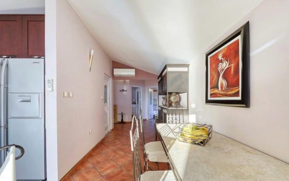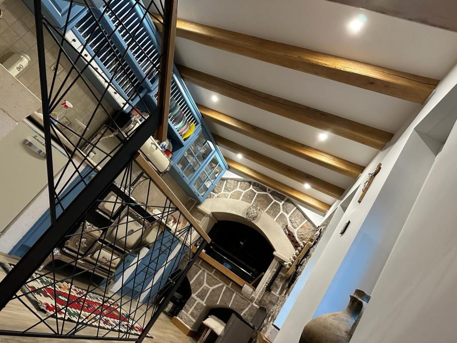 U prvi stan vodi malo stubište s kojeg se ulazi u dnevni boravak s blagovaonicom, zatim opet par stepenica vode u posebno zanimljivu kuhinju s pečenjarom ispod koje se nalazi budući vinski podrum ili nešto slično.... a onda opet par stepenica pa spavaća soba s jedne strane i galerija s druge strane koja može biti dodatna soba ili igraonica za djecu i onda nakon još par stepenica izlaz na krovnu terasu s koje puca čarobni pogled na sve strane.