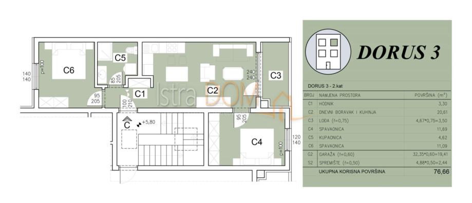 smješten je na drugom katu zgrade D te ima ukupnu neto površinu od 76,66m², koja uključuje stambeni prostor, lođu, garažno parkirno mjesto i spremište. Stan se sastoji od otvorenog dnevnog prostora s kuhinjom i blagovaonicom, dvije spavaće sobe, kupaonice i hodnika te unutarnjeg spremišta. Lođa pruža ugodan vanjski prostor idealan za odmor i boravak na otvorenom. Uz stan dolazi garažno parkirno mjesto te spremište u prizemlju zgrade.