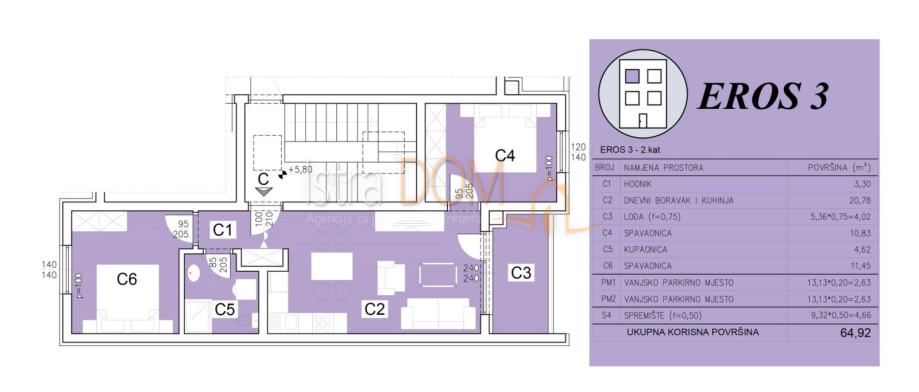 smješten je na drugom katu zgrade E, te ima ukupnu neto površinu od 64.92m², koja uključuje stambeni prostor, lođu, dva vanjska parkirna mjesta i spremište. Stan se sastoji od otvorenog dnevnog prostora s kuhinjom i blagovaonicom, dvije spavaće sobe, kupaonice i hodnika te unutarnjeg spremišta. Lođa pruža ugodan vanjski prostor idealan za odmor i boravak na otvorenom. Uz stan dolaze dva vanjska parkirna mjesta te spremište u prizemlju zgrade.