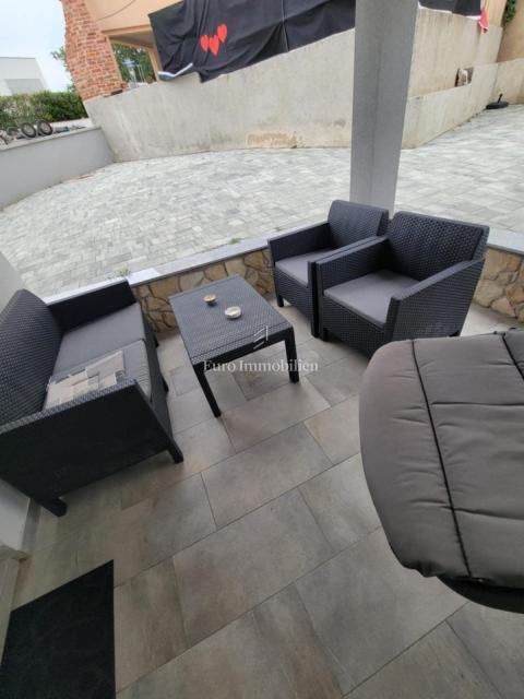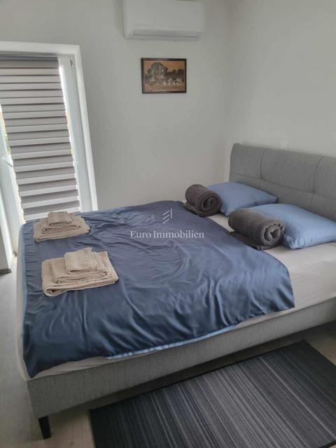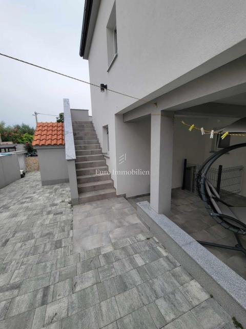Sastoji se od dva jednosobna stana u prizemlju te velikog dvosobnog sa dnevnim boravkom na katu. Okućnica je potpuno popločana u okviru koje je smješten bazen te parkiralište za više automobila. Velika prednost kuće je i solarna elektrana koja stvara struju za cijelu kuću te zagrijava vodu također za cijelu kuću, tako da je utošak energije zanemariv.
