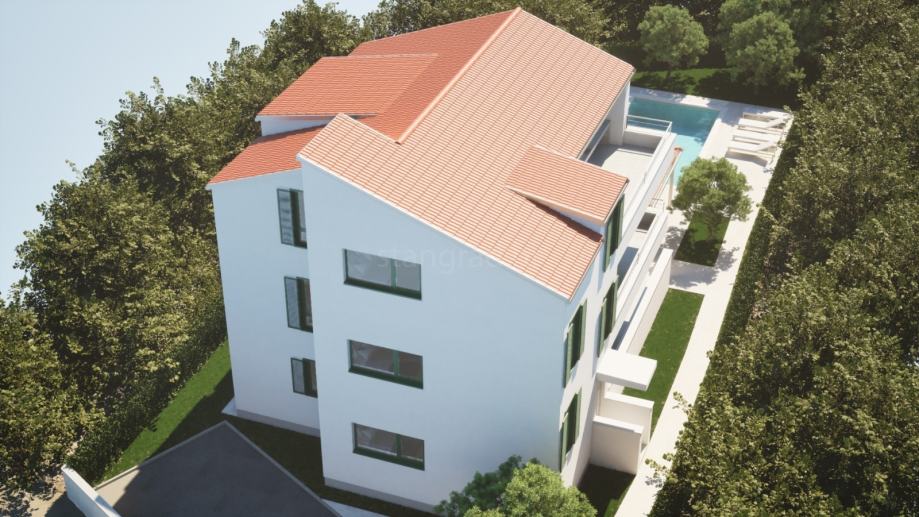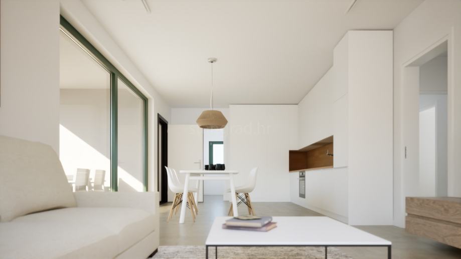 Apartman se nalazi na prvom katu moderne stambene zgrade. Njegova ukupna površina iznosi 98 m2, a sastoji se od open space dnevnog boravka s kuhinjom i blagovaonicom, tri spavaće sobe te dvije elegantno uređene kupaonice. Iz dnevnog boravka izlazi se na natkrivenu terasu od 17 m², idealnu za opuštanje i boravak na otvorenom. Apartmanu pripada jedno parkirno mjesto. Završetak radova predviđen je do kraja 2026. godine.