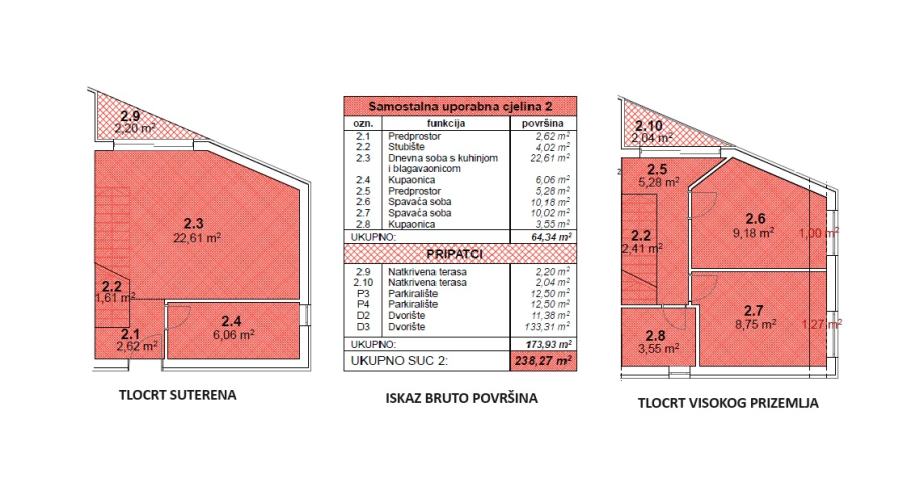1. KAT: stubište, predsoblje, spavaća soba 1, spavaća soba 2, kupaonica sa wc-om, balkon