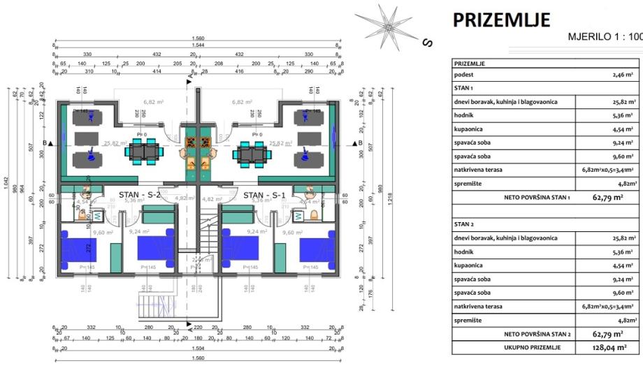 Apartman je površine 62,79 m2 + vrt 42,46 m2 (koef. 0,20) + parking 12 m2 (koef. 0,25).