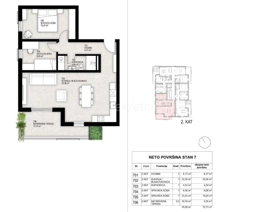 Izdvajamo iz ponude: Dvosoban stan na drugom katu površine 72,71 m². Stan se sastoji od dvije spavaće sobe, hodnika, kupaonice, dnevnog boravka, kuhinje s blagovaonicom te natkrivene terase. Zahvaljujući funkcionalnom rasporedu i pametno iskorištenom prostoru, idealan je za parove ili pojedince koji žele udobnost, privatnost i praktičnost suvremenog stanovanja.