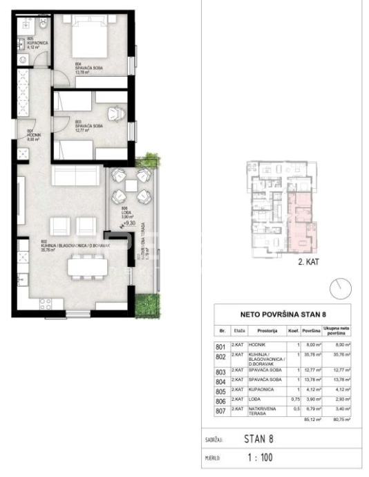 stan S8 n 2. katu, neto površine 80,75 m², s pažljivo osmišljenim rasporedom: dvije prostrane spavaće sobe, prostrani dnevni boravak, kuhinja s blagovaonicom, kupaonica, hodnik, lođa te natkrivena terasa za uživanje u pogledu i miru.