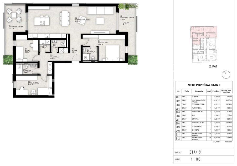 stan S9 na 2. katu, neto površine 119,78 m², s pažljivo osmišljenim rasporedom: tri prostrane spavaće sobe, prostrani dnevni boravak, kuhinja s blagovaonicom, 2 kupaonice, Wc, hodnik, predosoblje, ostava i 2 natkrivene terase od 13,17m2 i 10,67m2 za uživanje u pogledu i miru.