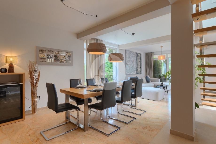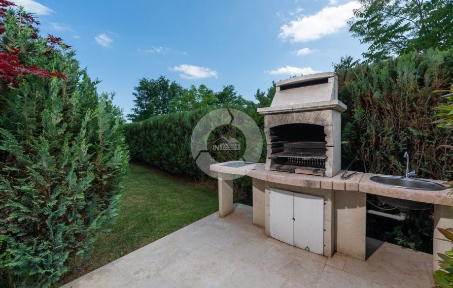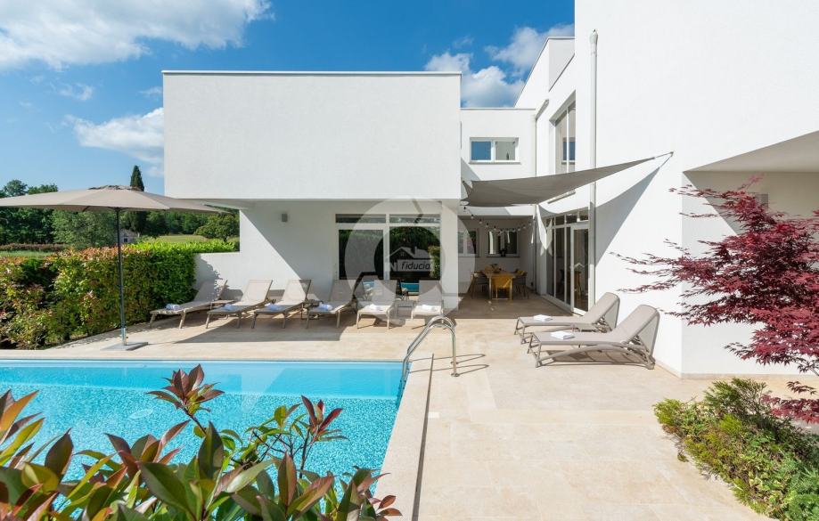 Luksuzna vila prodaje se u malom istarskom gradiću nedaleko od Rovinja (25 km), na miroj lokaciji. Sadržaji grada su na svega nekoliko metara. Sagrađena je 2014. godine, no uloženo je dodatno u nju 2022. godine. Specifično je kod ove prekrasne vile što ima dva bazena, unutarnji i vanjski, te saunu i fitness sobu, odnosno jedan dio kuće je wellness prostor. Unutarnji bazen je grijani, tako da se bazen može koristiti kroz cijelu godinu. Trenutno je u turističkom najmu, pa je idealna za onoga koji se time želi nastaviti baviti, no može biti i kao kuća za življenje. Sastoji se od prizemlja i kata. U prizemlju se, osim wellness dijela, nalazi hodnik, spremište, garderoba, wc, spavaća soba, kupaona, kotlovnica, kuhinja sa blagovaonom, dnevni boravak sa izlaskom na natrkivenu terasu i vrt. Unutarnjim stepenicama se odlazi na kat gdje su smještene četiri spavaće sobe, svaka sa svojim kupatilom. Dvije sobe imaju i vlasnite balkone. Prvi investitor je kuću gradio za sebe, primarno se bavi gradnjom kuća, pa je gradnja bila na visokoj razini. Tako je sustav grijanja napravio putem toplotne pumpe - podno grijanje, u sobama su fenhojleri, dok su za toplu vodu instalirani solarni paneli. U vrtu se nalaze parkirna mjesta, malo igralište za djecu, roštilj, travnjak sa automatskim navodnjavanjem, mediteranske biljke i vanjski bazen od 40 m2 sa terasama. Vrt je ograđen zidom i zelenom ogradom, te garantira privatnost. Lokacija je idealna za one koji ne žele biti blizu turističke gužve, na mirnoj lokaciji ili za one koji se žele baviti turističkom najmom pa tako mogu od prodavatelja preuzeti cijeli posao i buking za 2025. godinu koji je u tijeku.