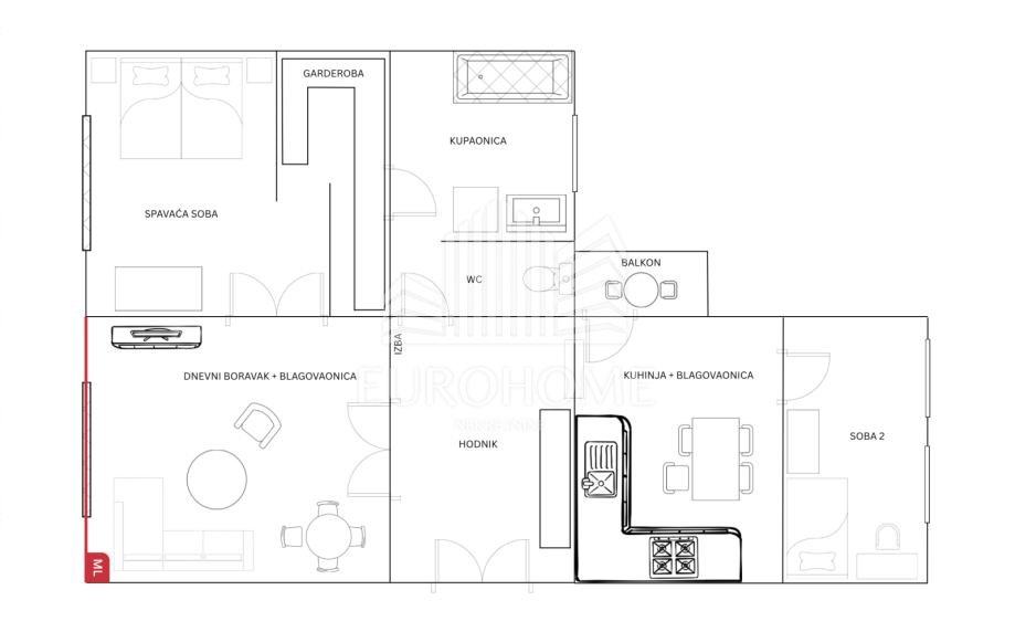 (postoji mogućnost pregrađivanja kupaonice za dobivanje zasebnog sanitarnog čvora)