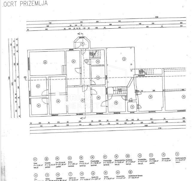 Prizemlje kuće sastoji se od velikog dnevnog boravka + kuhinje + blagovaonice, četiri sobe, kupaonice i WC-a.