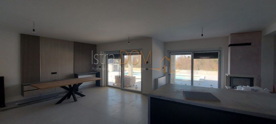 - Velike staklene stijene koje omogućuju obilje dnevnog svjetla i izlaz na okućnicu s bazenom