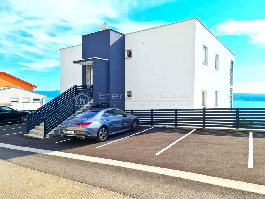 Sastoji se od predulaza, kupaone, dvije spavaće sobe, kuhinje i blagovaone te prostranoga dnevnoga boravka koji ima izlaz na veliku natkrivenu terasu sa koje se pruža krasan panoramski pogled na more, grad i otok Krk!