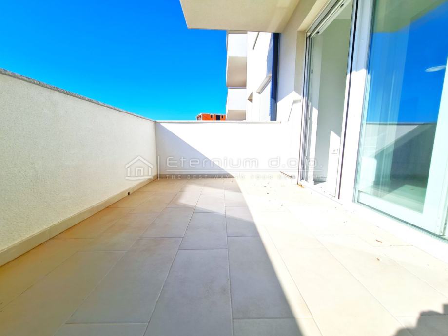Stan se sastoji od kupaone, spavaće sobe te dnevnoga dijela kojega čine prostrani dnevni boravak, kuhinja i blagovaona te lijepa natkrivena terasa. Izgrađen i opremljen je modernim materijalima, pa tu imamo protuprovalna vrata, kvalitetnu keramiku i sanitarije, PVC stolariju, klimu, led rasvjetu itd.