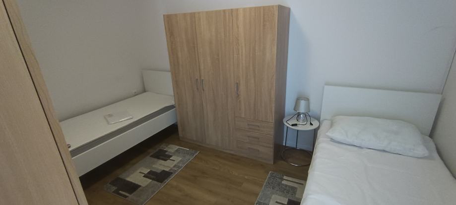 Stan se sastoji od kuhinje s blagovaonicom, 3 sobe, kupatila, wc i terase, odmah je uselijv i iznajmljuje se isključivo studentima/cama ili našim radnicama na duži period. Cijena za 3 osobe je 800Eura, za 4 osobe 900Eura a za 5 osoba je 1000Eura..