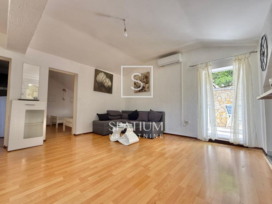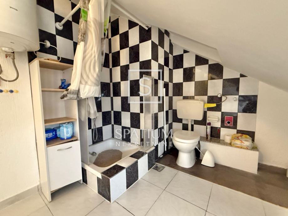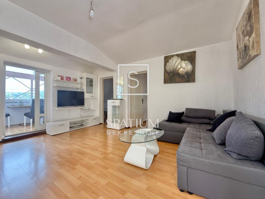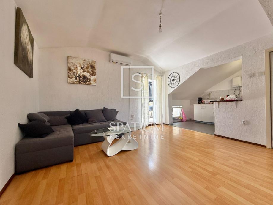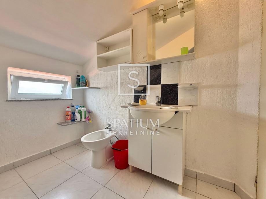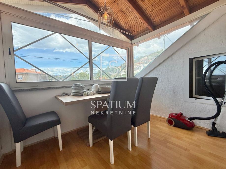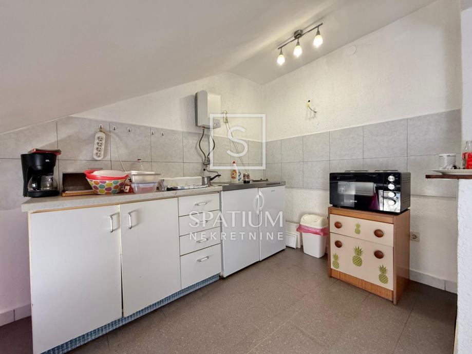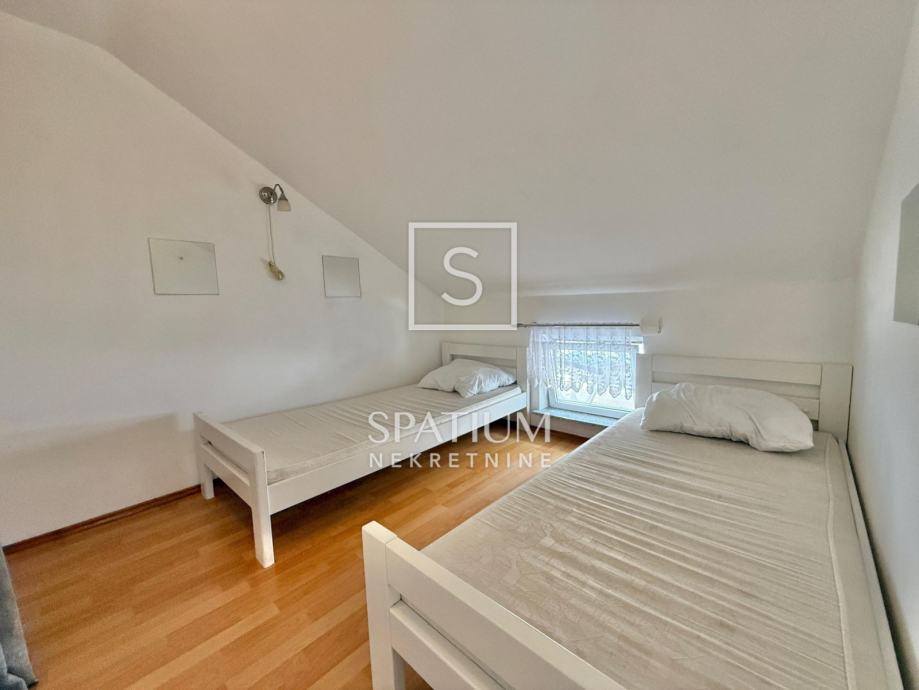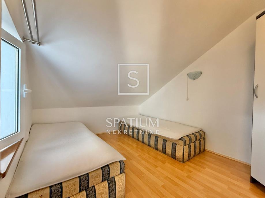 Unutarnjim stepeništem dolazi se na gornju etažu odnosno potkrovlje - površine 70m2, te se sastoji od velikog dnevnog boravka, kuhinje, dvije spavaće sobe, kupaonice, hodnika, zatvorene lođe i terase.