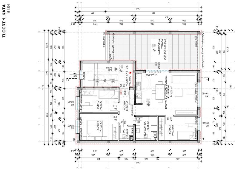 Stan je smješten na prvom katu manje stambene zgrade s ukupno tri stambene jedinice, koja je trenutno u fazi izgradnje. Raspored prostorija uključuje ulazni hodnik, prostrani dnevni boravak s izlazom na veliku terasu površine 30 m², kuhinju s blagovaonicom, tri spavaće sobe, kupaonicu te zaseban WC. Stanu pripada i vanjsko parkirno mjesto koje je uključeno u cijenu.