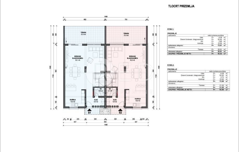 -Prostrani dnevni boravak s blagovaonicom (ugrađenom klimom) i izlazom na natkrivenu terasu površine 21 m²