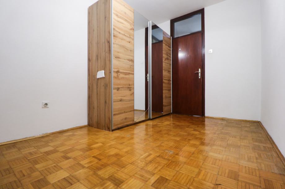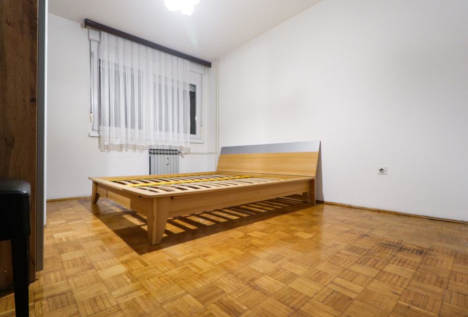 Djelomično je namješten - ima kuhinju, kauč na razvlačenje, ormare, bračni krevet 180x200 u jednoj spavaćoj sobi, klima uređaj, stolić, blagovaonski stol, stolice, kadu, toalet, PVC stolariju, protuprovalna vrata, portafon i sl. Stan ima mnogo spremišnog prostora - ormari, ormarići, hodnik sa nišom za stvari, ostava i vlastito spremište u podrumu.