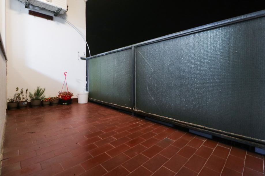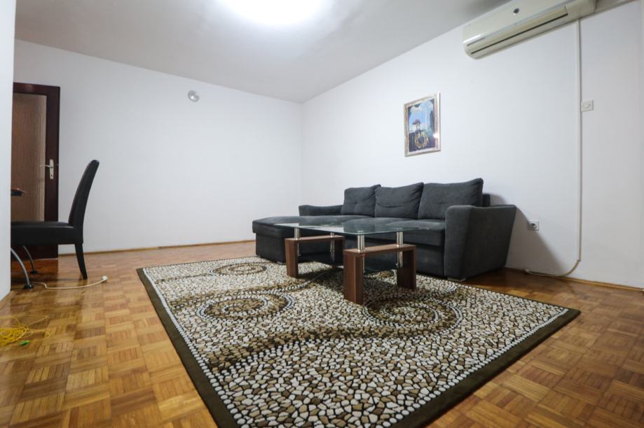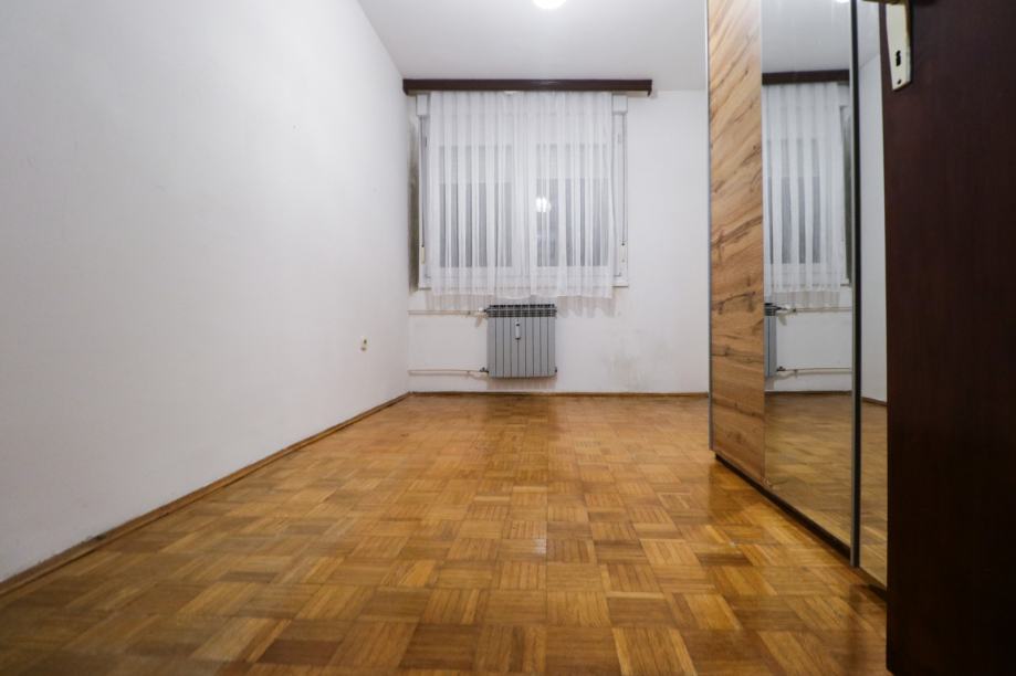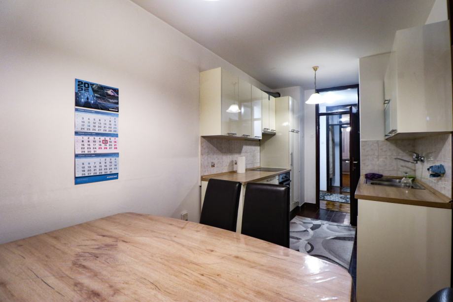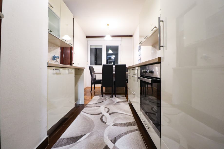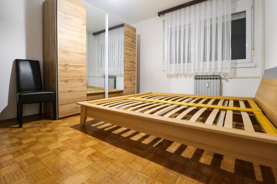 Djelomično je namješten - ima kuhinju, kauč na razvlačenje, ormare, bračni krevet 180x200 u jednoj spavaćoj sobi, klima uređaj, stolić, blagovaonski stol, stolice, kadu, toalet, PVC stolariju, protuprovalna vrata, portafon i sl. Stan ima mnogo spremišnog prostora - ormari, ormarići, hodnik sa nišom za stvari, ostava i vlastito spremište u podrumu.