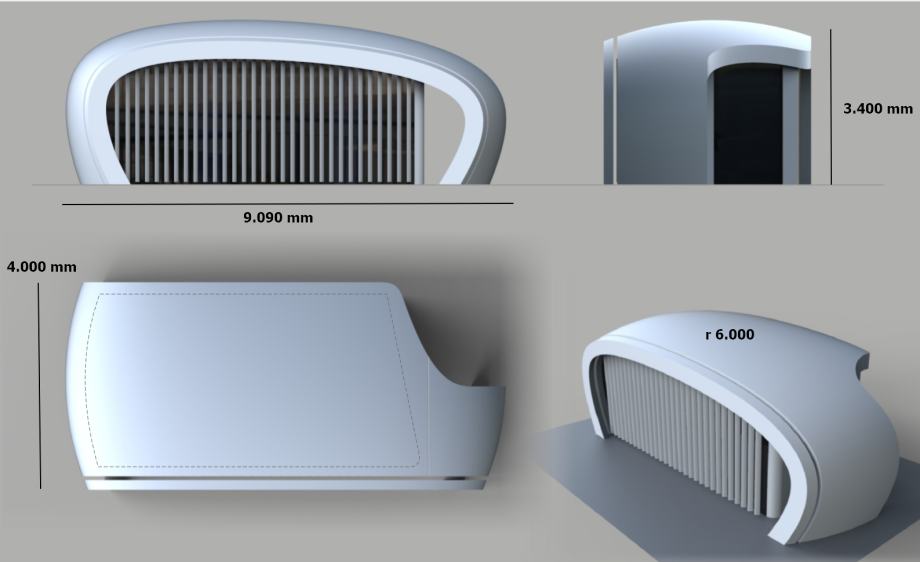 Zakrivljen (free-form) oblik i vrlo elegantne linije, tipične za najveća remek-djela svjetske moderne arhitekture. Ovaj put u malim dimenzijama i znatno jeftiniji u usporedbi, zahvaljujući patentiranoj tehnologiji dvo i više krivulje savijanja metala.