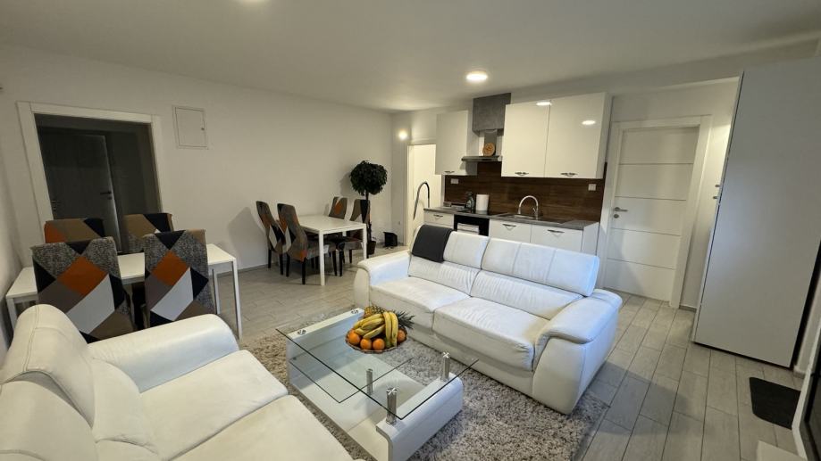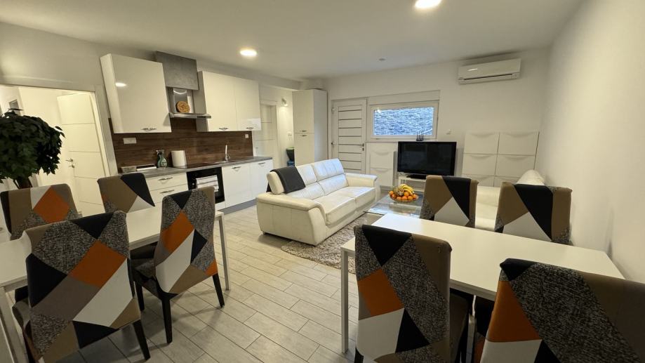 Kuhinja je kompletno opremljena sa pećnicom, staklokeramičkom pločom za kuhanje, frižiderom sa ledenicom, suđericom, napom, te priborom za kuhanje i suđem. Prostor gdje je kuhinja i blagovaonica ima klima uređaj.