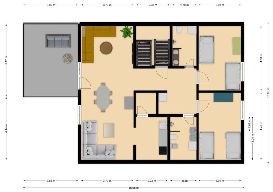 The apartment consists of 2 bathrooms, a kitchen, a living room with three sofas and a 65" Samsung TV, a dining area, a terrace, and a washer and a tumble dryer