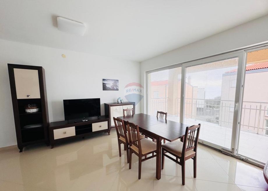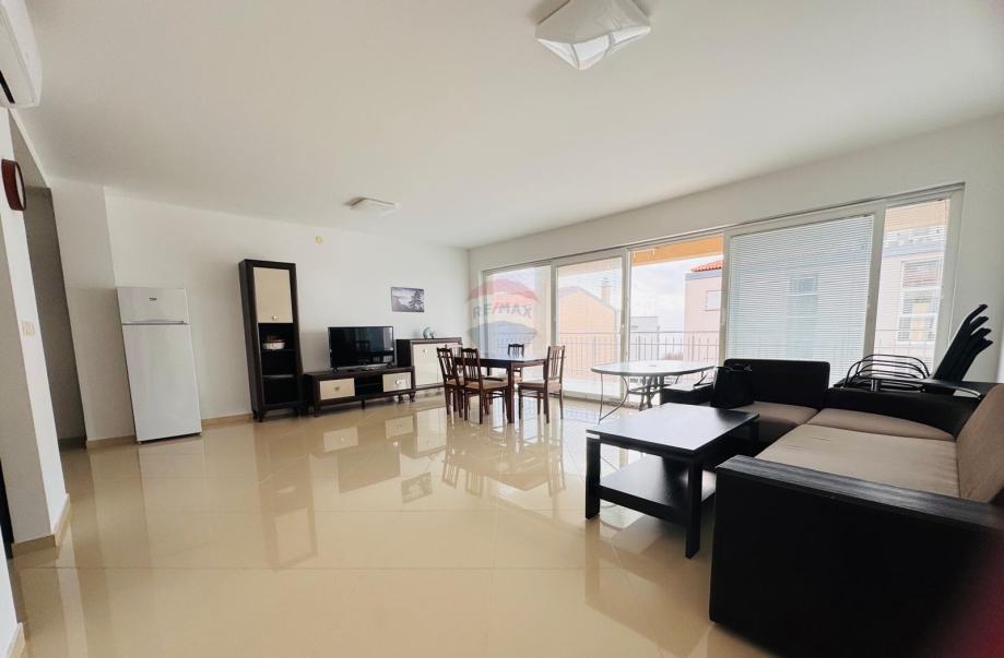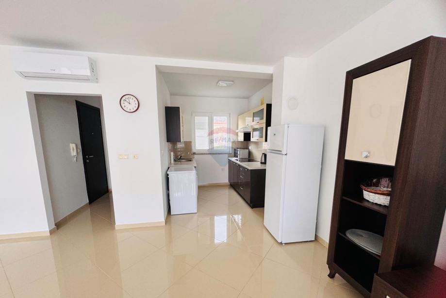 Sastoji se od ulaznog dijela, dnevnog boravka i kuhinje u otvorenom i svijetlom prostoru koji izlazi na terasu.