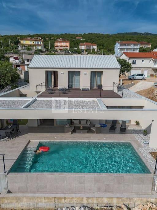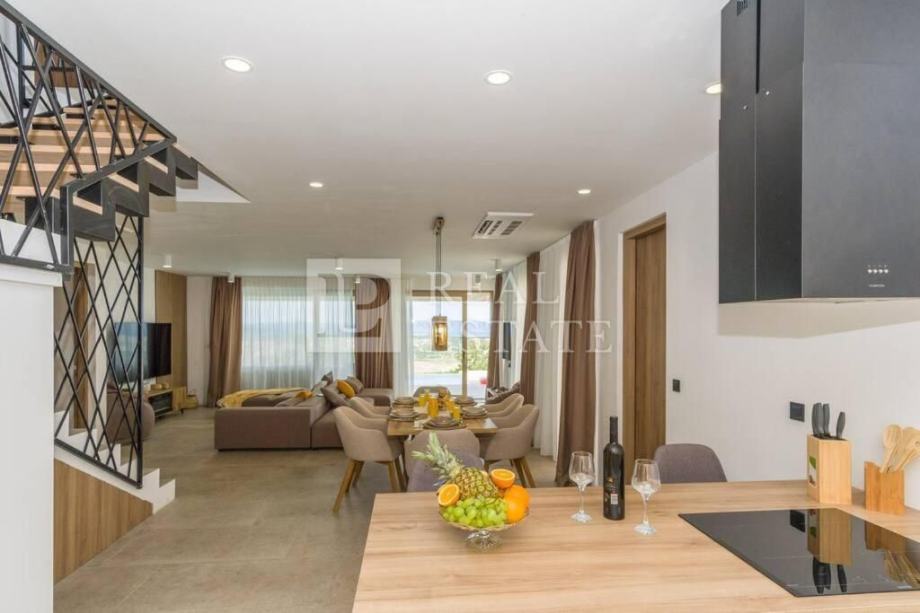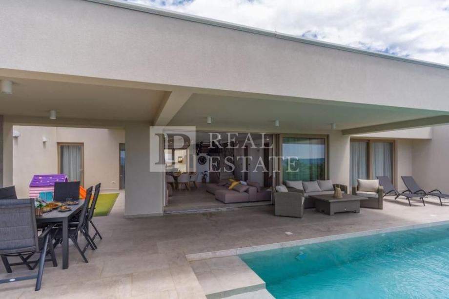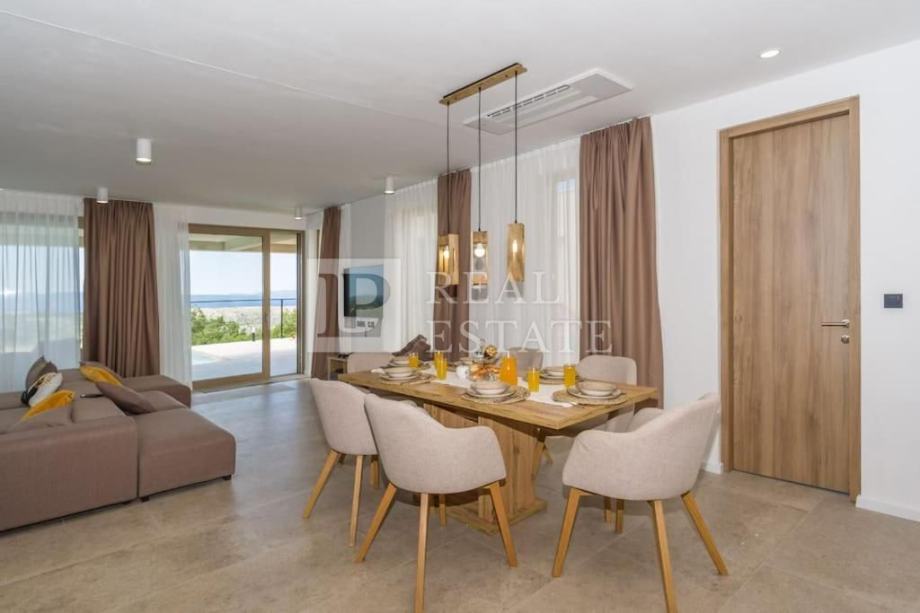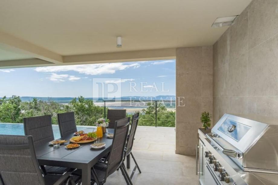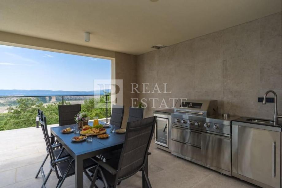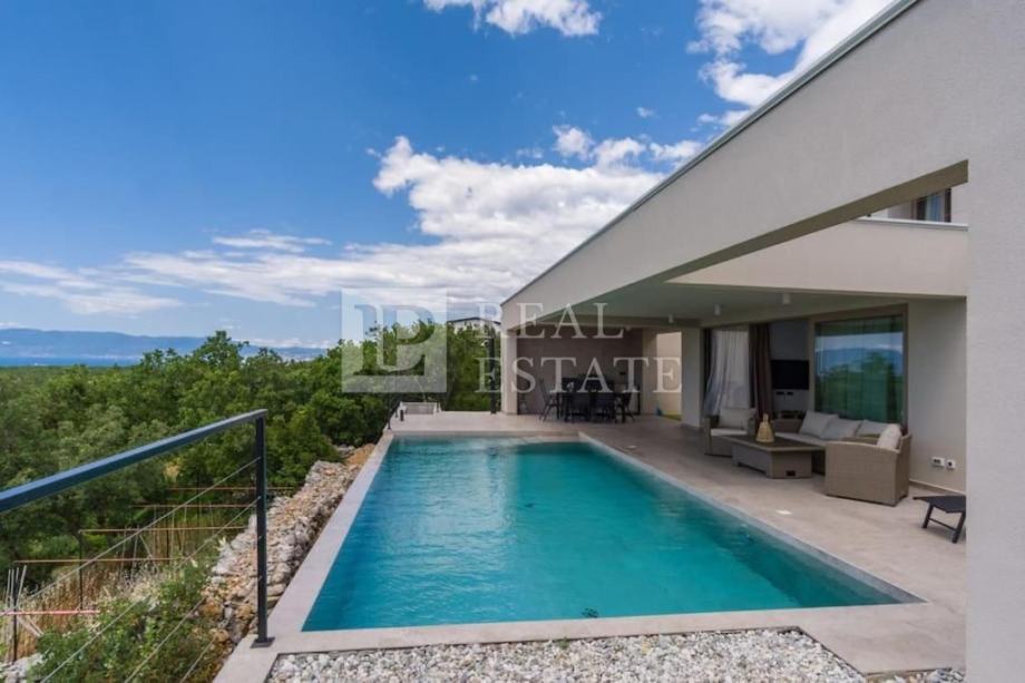 Vila se nalazi na parceli od 615 m2, a prostire se na dvije etaže. U prizemlju se nalaze kuhinja s blagovaonicom i dnevni boravak koji su otvorenog koncepta i imaju izlaz na terasu s bazenom, fitness s kupaonicom, dodatna prostorija s pripremom za saunu, WC i jedna prostrana spavaća soba s vlastitom kupaonicom i izlazom na terasu s bazenom. Unutarnjim stepenicama penjemo se na kat gdje su se smjestile još dvije komforne spavaće sobe s vlastitim kupaonicama i izlazom na terasu s koje se prostire očaravajući pogled na cijeli Kvarner.