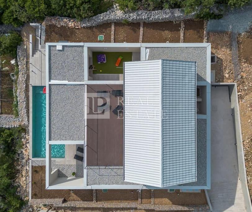 Unutar okućnice se nalaze terasa s grijanim bazenom, vrt s mediteranskim biljem, dječje igralište te predivna, potpuno opremljena ljetna kuhinja s roštiljem, sudoperom, mini barom i svih sadržajima potrebnim za opušteno druženje u krugu obitelji i prijatelja.