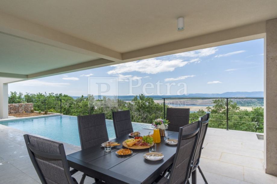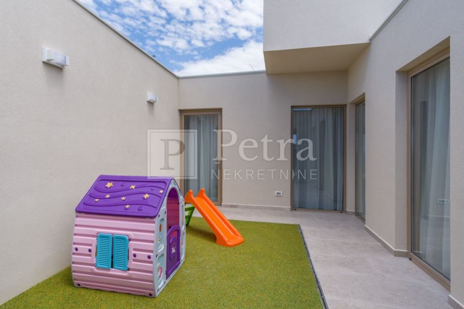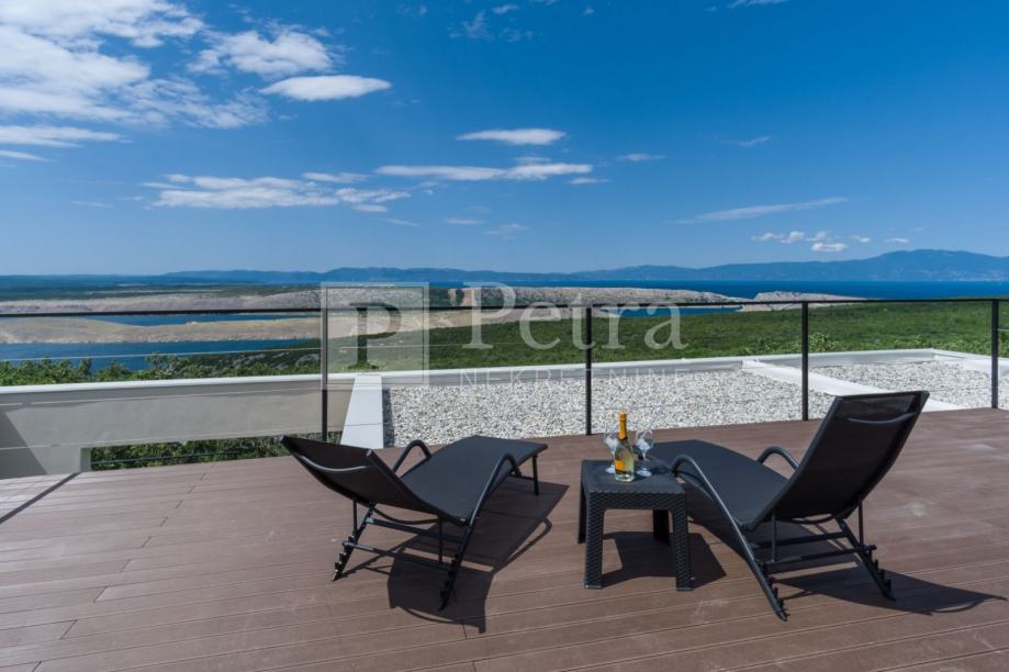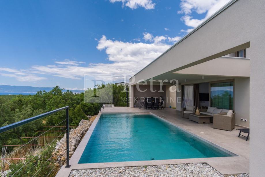 Prekrasna novoizgrađena vila sa otvorenim pogledom na more. Nalazi se na terenu površine 615m2, a sastoji se od prizemlja i kata. Direktan pristup je sa sjeverne strane gdje se nalaze tri parkirna mjesta. U prizemlju se nalazi dnevni boravak, kuhinja sa blagovaonom, spavaća soba sa kupaonicom, tolaet u hodniku, te teretana sa vlastitom kupaonicom te prostorijom predviđenom za saunu. Iz dnevnog boravka, spavaće sobe i fitnessa je direktan izlaz na predivnu terasu sa bazenom, roštiljem te dječjim igralištem. Na katu se nalaze dvije spavaće sobe sa vlastitom kupaonicom i terasa. Cijela nekretnina je opremljena sustavom grijanja i klimatizacije, a kupaonice podnim grijanjem. Nekretnina je u funkciji turističkog najma.