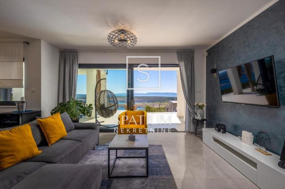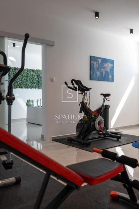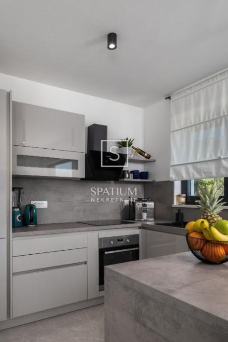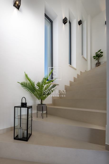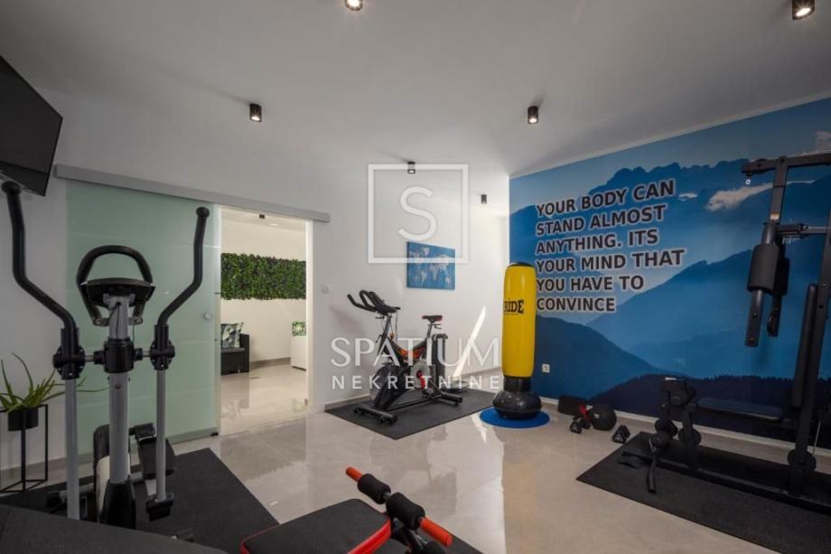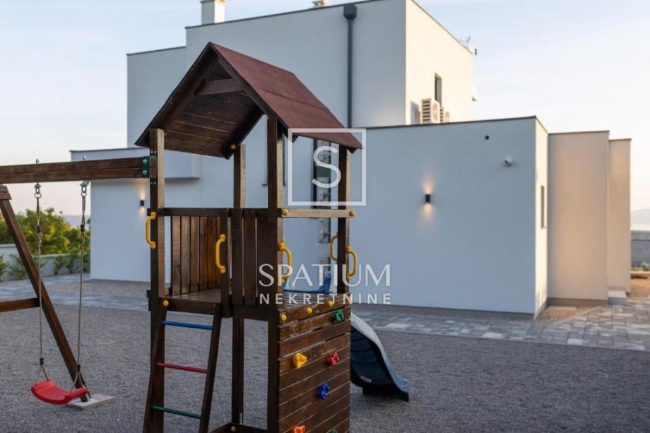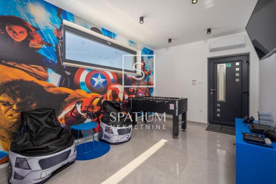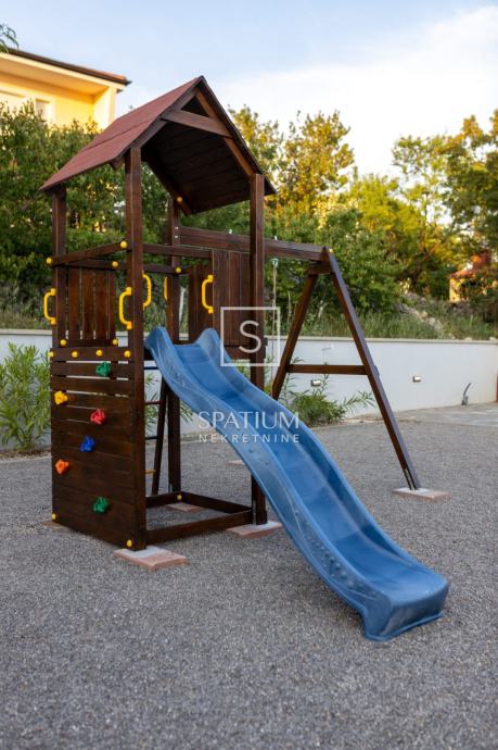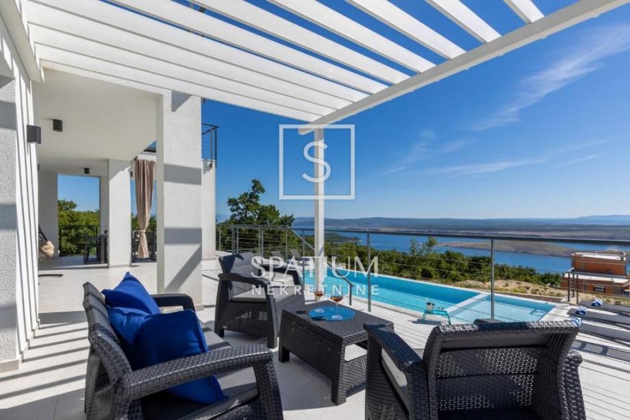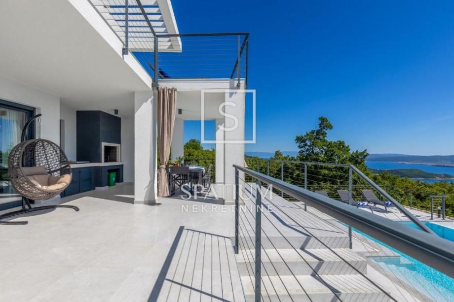 ŠMRIKA, u ponudu smo dobili obiteljsku vilu s panoramskim pogledom na Kvarner. U prizemlju je spavaća soba s vlastitom kupaonicom, WC-om, kuhinjom s blagovaonicom i dnevni boravak iz kojega se izlazi na terasu s prostorom za druženje. Unutarnje stubište vodi na kat, a sastoji se od dvije spavaće sobe od kojih svaka s vlastitom kupaonicom te terasa, suteren u kojemu su prostor za druženje s fitnessom, manji wellness te velika prostorija za tehniku. Kuća je građena visokokvalitetnim materijalima kako u interijeru tako i u eksterijeru. Veliki popločani parking za više automobila ispred kuće. S bočne strane je prilaz stepeništem, iza je popločana terasa s priključcima struje i vode. Ispred kuće na prostranom sunčalištu dominira "Infinity" bazen uz koji je smješten manji dječji bazen. Karakteristika ove prelijepe nekretnine je okućnica koja je u potpunosti ograđena ručno rađenim kamenim zidom.