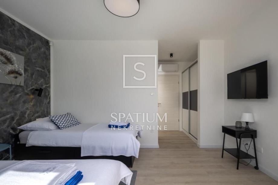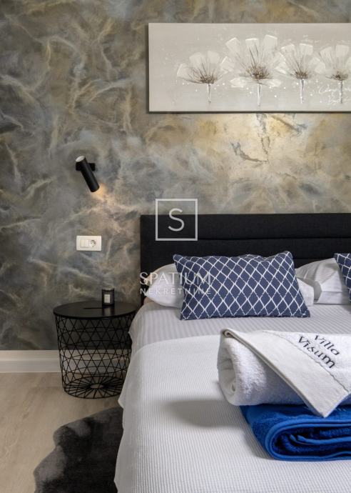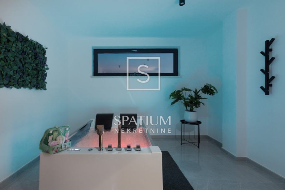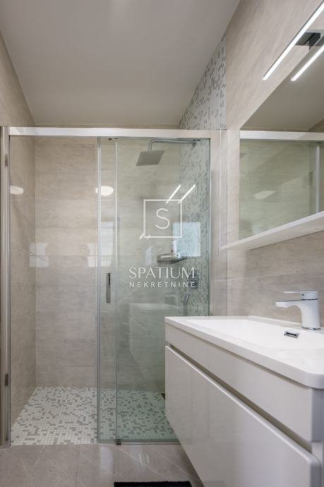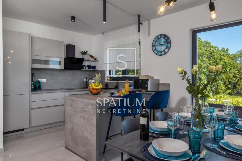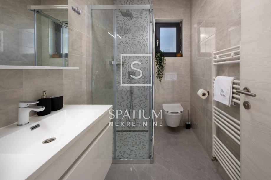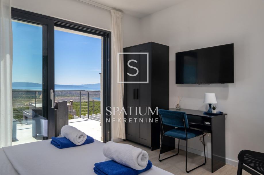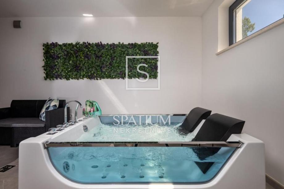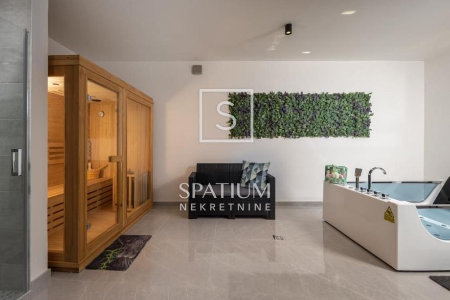 ŠMRIKA, u ponudu smo dobili obiteljsku vilu s panoramskim pogledom na Kvarner. U prizemlju je spavaća soba s vlastitom kupaonicom, WC-om, kuhinjom s blagovaonicom i dnevni boravak iz kojega se izlazi na terasu s prostorom za druženje. Unutarnje stubište vodi na kat, a sastoji se od dvije spavaće sobe od kojih svaka s vlastitom kupaonicom te terasa, suteren u kojemu su prostor za druženje s fitnessom, manji wellness te velika prostorija za tehniku. Kuća je građena visokokvalitetnim materijalima kako u interijeru tako i u eksterijeru. Veliki popločani parking za više automobila ispred kuće. S bočne strane je prilaz stepeništem, iza je popločana terasa s priključcima struje i vode. Ispred kuće na prostranom sunčalištu dominira "Infinity" bazen uz koji je smješten manji dječji bazen. Karakteristika ove prelijepe nekretnine je okućnica koja je u potpunosti ograđena ručno rađenim kamenim zidom.