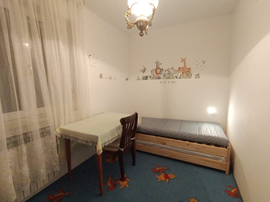 A room is for rent on the first floor of a house in Dubrava. The owners live on the ground floor and have their own separate entrance. The room is furnished with a new bed and mattress, a desk, a chair, and built-in shelving/wardrobe.