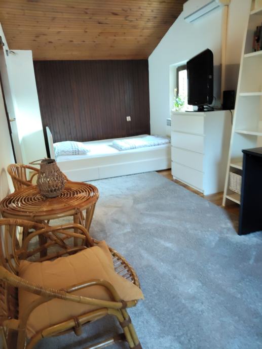 Iznajmljujem potpuno namještenu sobu u kući. Soba je na katu kuće na kojim se nalazi i wc. Soba ima 15m2, potpuno je namještena, krevet veličine 140x200, tv, klima, Internet, ugradbeni ormar i radni stol. Mogućnost korištenja kuhinje u prizemlju i kupaonice sa perilicom rublja.