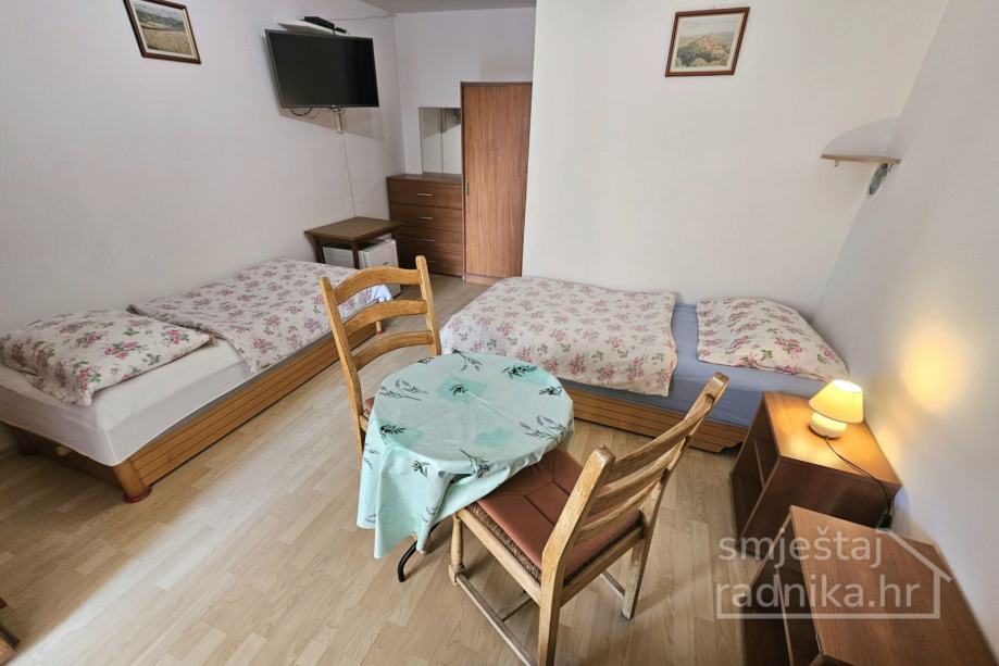 Svaka soba se sastoji od dva odvojena kreveta, velikog ormara za pohranu stvari, malog stola sa dvije stolice, klima uređaj, tv te kupaonice i terase. Na katu se nalazi kuhinja koja je slobodna za upotrebu. Smještaj se nalazi u blizini Aquaparka Istralandije i pogodan je za smještaj radnika.