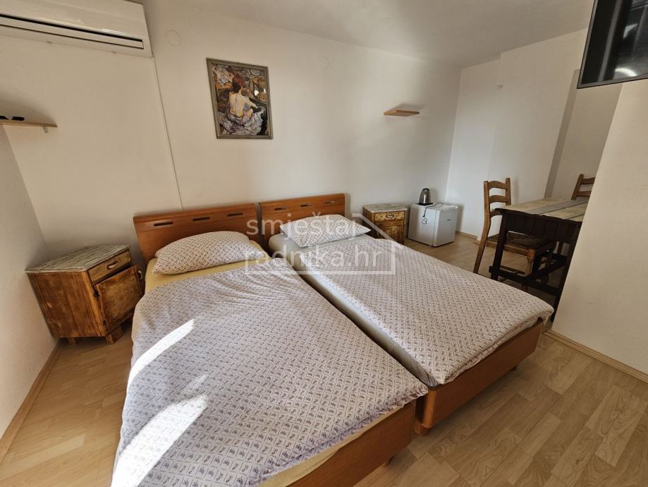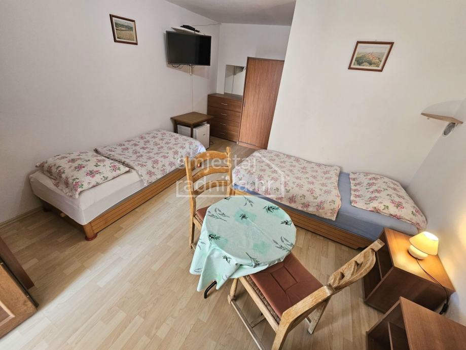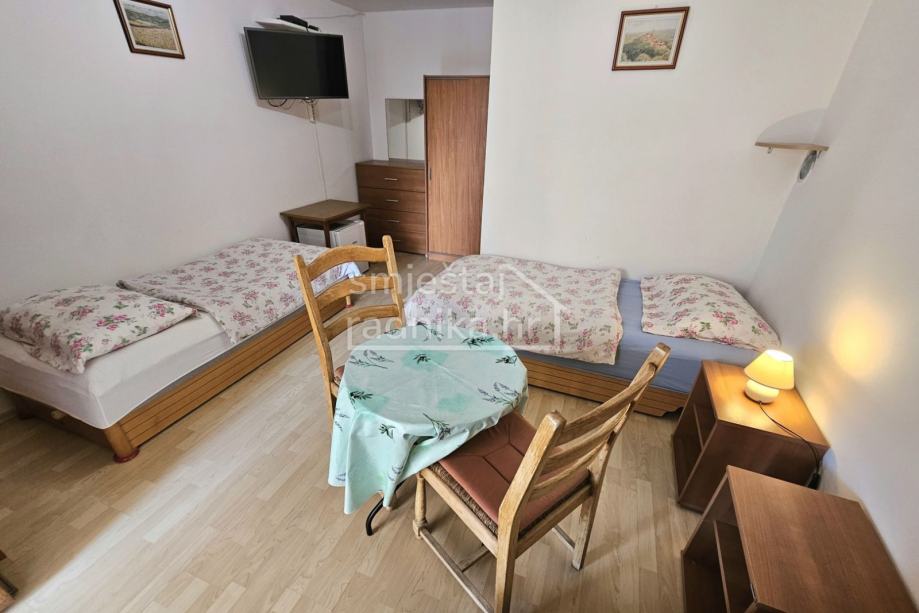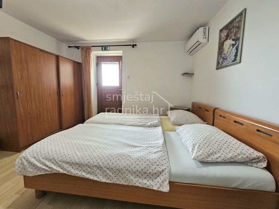 Svaka soba se sastoji od dva odvojena kreveta, velikog ormara za pohranu stvari, malog stola sa dvije stolice, klima uređaj, tv te kupaonice i terase. Na katu se nalazi kuhinja koja je slobodna za upotrebu. Smještaj se nalazi u blizini Aquaparka Istralandije i pogodan je za smještaj radnika.