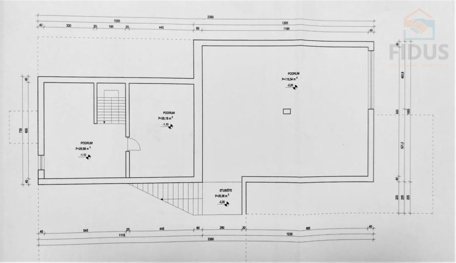 Podrum je bruto površine 214,66 m2, a sastoji se od 2 prostorije bruto površine 77,54 m2 (visina stropa 2,5 m) i 137,28 m2 (visina stropa 3,15 m).