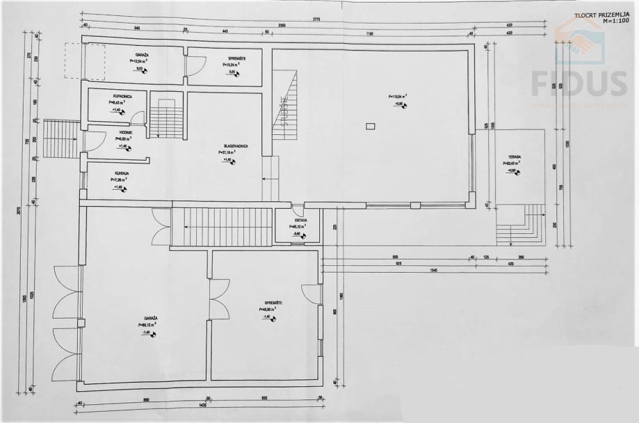 Prizemlje je bruto površine 348,65 m2, prostrano je i uređeno, ima izlaz na terasu i dvorište.