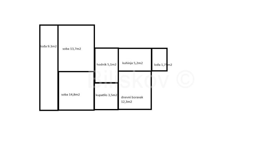 Sastoji se od dnevnog boravka, kuhinje s izlazom na manju lođu, dvije spavaće sobe s izlazom na veliku lođu i kupaonice.